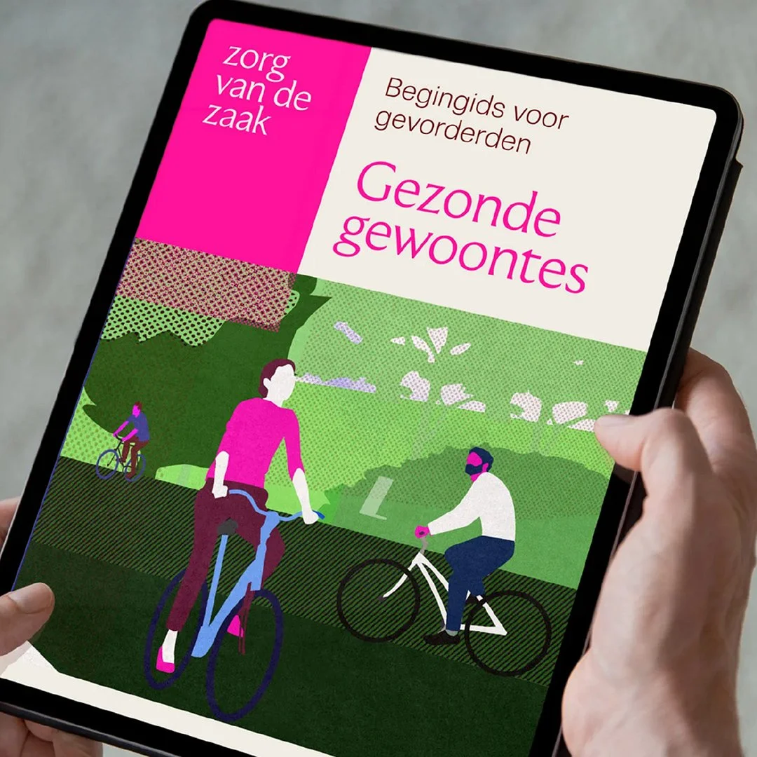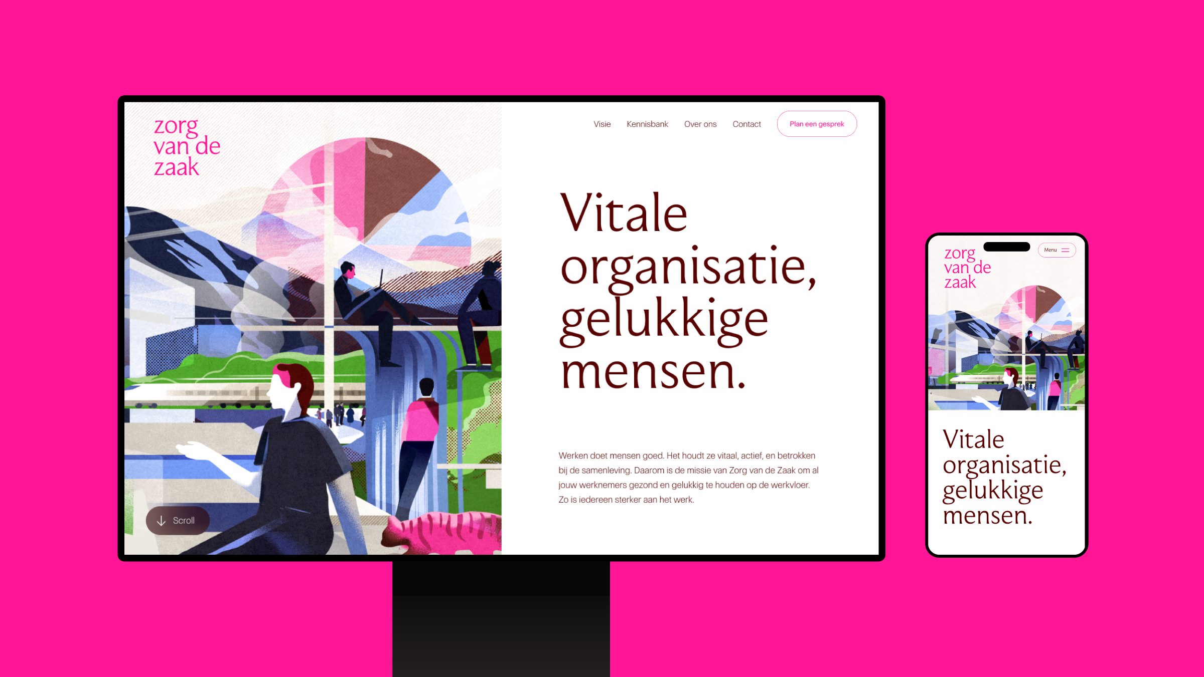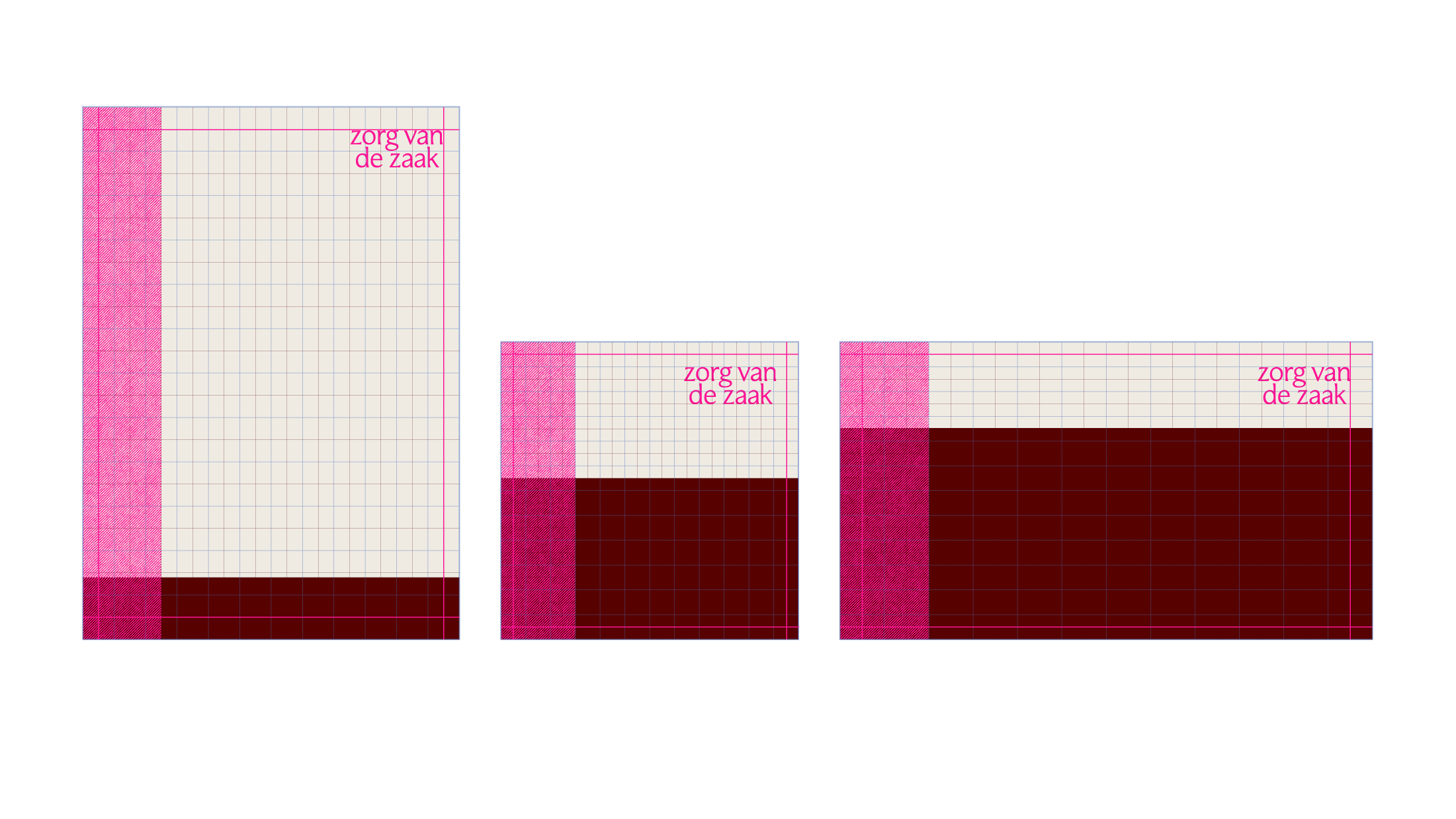 Zorg van de Zaak focusses on where work meets wellbeing, where professional life meets private life. That isn’t always smooth or perfect. This can be seen in the brand patterns From a distance they seem to be a lighter shade of the base color, but at closer inspection they are a rough-edged pattern of two different colors.